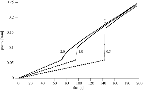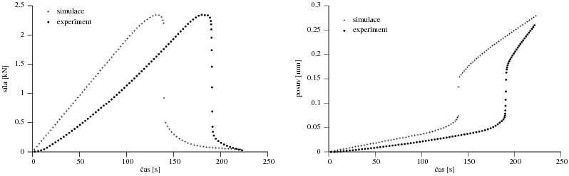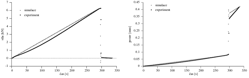 je dána funkcí odpovídající posunu příčníku up(t) =vpt. Pohledem na grafy časových řad se můžeme přesvědčit, že ačkoliv u výsledků simulace tomu tak je, výsledky experimentů ukazují na proměnlivou rychlost zatěžování. Poznamenejme, že u vzorku č. 2 se výsledek simulace více rozchází s naměřenými časovými řadami, viz obr. 8.