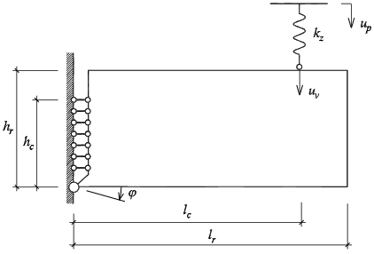 Trámec se zářezem je pro účely simulace nahrazen modelem s jedním stupněm volnosti, který vznikl rozšířením statického modelu [Frantík 2004]. Je uvažována symetrická polovina trámce nahrazená tuhou deskou připojenou kloubem a tahovými vlákny, viz obr. 3. Vliv tuhosti lisu je vzat pouze lineární pružinou s tuhostí kz. Stav modelu v čase t je jednoznačně určen pootočením desky