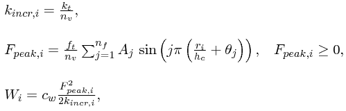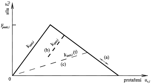 Každé vlákno je dáno třemi parametry (viz obr. 4): tuhostí kincr,i, pevností Fpeak,i a velikostí celkové přetvárné práce Wi nutné pro přetržení vlákna.