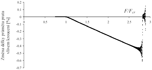 Na obr. 10 je zobrazena závislost změny délky průmětu prutu do jeho osy vlivem kroucení. Za povšimnutí stojí její téměř lineární charakter. Tato vlastnost umožnila zpřesnění stanovené hodnoty kritické síly. Další zajímavostí je zobrazený ustalovací děj na počátku simulace (v grafu zcela vpravo). Jedná se o dokmitávání z počátečního nepřetvořeného stavu.