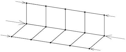 Na obr. 3 je znázorněno rozdělení L-profilu na dílce, v jejichž vrcholech jsou umístěny hmotné body. Zatížení osovým tlakem je provedeno pomocí trojice sil na volných koncích modelu prutu. Trojice sil má výslednici na střednici prutu i v případě změny tvaru průřezu.