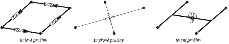 Každý dílec, ze kterého se model prutu skládá, obsahuje vnitřní pružiny, jejichž schémata jsou zobrazena na obr. 4. Jedná se o liniové pružiny zajišťující normálovou tuhost a přenos ohybových momentů (viz dále), smykové pružiny pro přenos smyku v rovině dílce a torzní pružiny pro vytvoření kroutící tuhosti dílce.