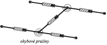 Již bylo zmíněno, že liniové pružiny plní rovněž funkci přenosu ohybových momentů. Proto jsou znázorněny na obr. 4 jako teleskopické tyče. Množinu pružin je totiž třeba doplnit rotační pružinou zajišťující vzájemnou ohybovou tuhost dvou spojených dílců. Znázornění této pružiny a její napojení na teleskopické tyče je vidět na obr. 5.