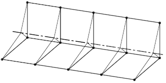 Zabezpečení střednice prutu je provedeno pomocí přídavných liniových pružin napojených na trojici hmotných bodů v každém průřezu prutu, viz obr. 6. V místě střednice prutu jsou pružiny napojeny na hmotné body s jedním stupněm volnosti ve směru střednice.