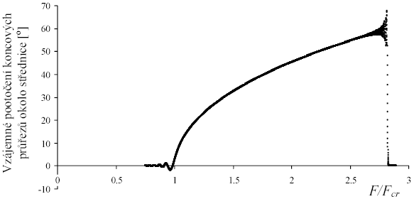 Na obr. 9 je vidět vypočtená závislost vzájemného pootočení koncových průřezů prutu okolo střednice. Je třeba zdůraznit, že znázorněné grafy jsou vynášeny jako přímý výsledek simulace. Nacházejí se zde i dynamické efekty. Počáteční stav je v grafech patrný vždy vpravo na ose. Při hodnotě vzpěrné síly cca F = 2.83Fcr došlo ke katastrofické ztrátě stability vybočením prutu. Ustálení do klidového stavu lze uvažovat při hodnotě cca F = 2.55Fcr. Dosažení bifurkačního bodu – tzv. měkké ztráty stability – odpovídá hodnota F = Fcr.