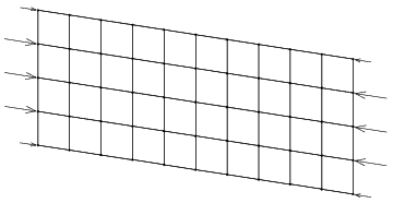 Na obr. 2 je znázorněno rozdělení deskového prutu na obdélníkové dílce, v jejichž vrcholech jsou umístěny hmotné body. Zatížení osovým tlakem je provedeno pomocí rovnoměrně rozložených sil, působících ve směru střednice nezdeformovaného prutu, na jeho volných koncích, viz obr. 2. Centrální hmotné body se mohou pohybovat pouze ve směru střednice deskového prutu. Ačkoliv tato okrajová podmínka není postačující k zajištění statické určitosti úlohy, není vhodné další podmínku přidávat z důvodu symetrie dynamických jevů.