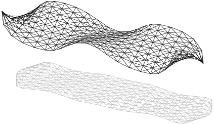 Deskový prut je uvažován o hmotnosti m = 1 kg z lineárního materiálu s normálovou tuhostí EA = 1 MN.m-1, smykovou tuhostí v rovině desky GAk = 0.1 MN.m-1, ohybovou tuhostí ve směru kolmém na rovinu desky EI = 100 Nm.rad-1 a tuhostí v kroucení okolo střednice GIt = 10 Nm.rad-1.