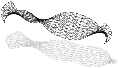 Pro upřesnění uveďme, že schémata tvarů na obr. 5 jsou přibližná v tom smyslu, že při zvětšování síly F budou vypadat v průmětu jinak. Doplňme, že tvary s více vlnami nejsou spirálovitě zatočené, jak se z průmětu zdá. Pro lepší představu je na obr. 6 zobrazen symetrický tvar s indexem 4 dosažený při síle F = 10 kN.