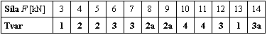 Tab. 1: Dosažené pokritické tvary pro různou sílu F