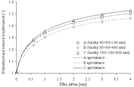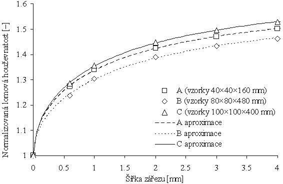 V předkládaném příspěvku autoři uvedli dvě regresní funkce pro tři používané geometrie zkoušky tříbodovým ohybem, které mohou sloužit pro výpočet korekce experimentálních výsledků prováděných na vzorcích s různou šířkou centrálního zářezu. Parametry regresních funkcí byly určeny pomocí aproximace hodnot získaných výpočtem [2]. Z hodnot uvedených funkcí v reálném rozsahu šířek zářezů vyplývá, že nadhodnocení lomové houževnatosti bez použití takovéto korekce může činit až asi 50%.
